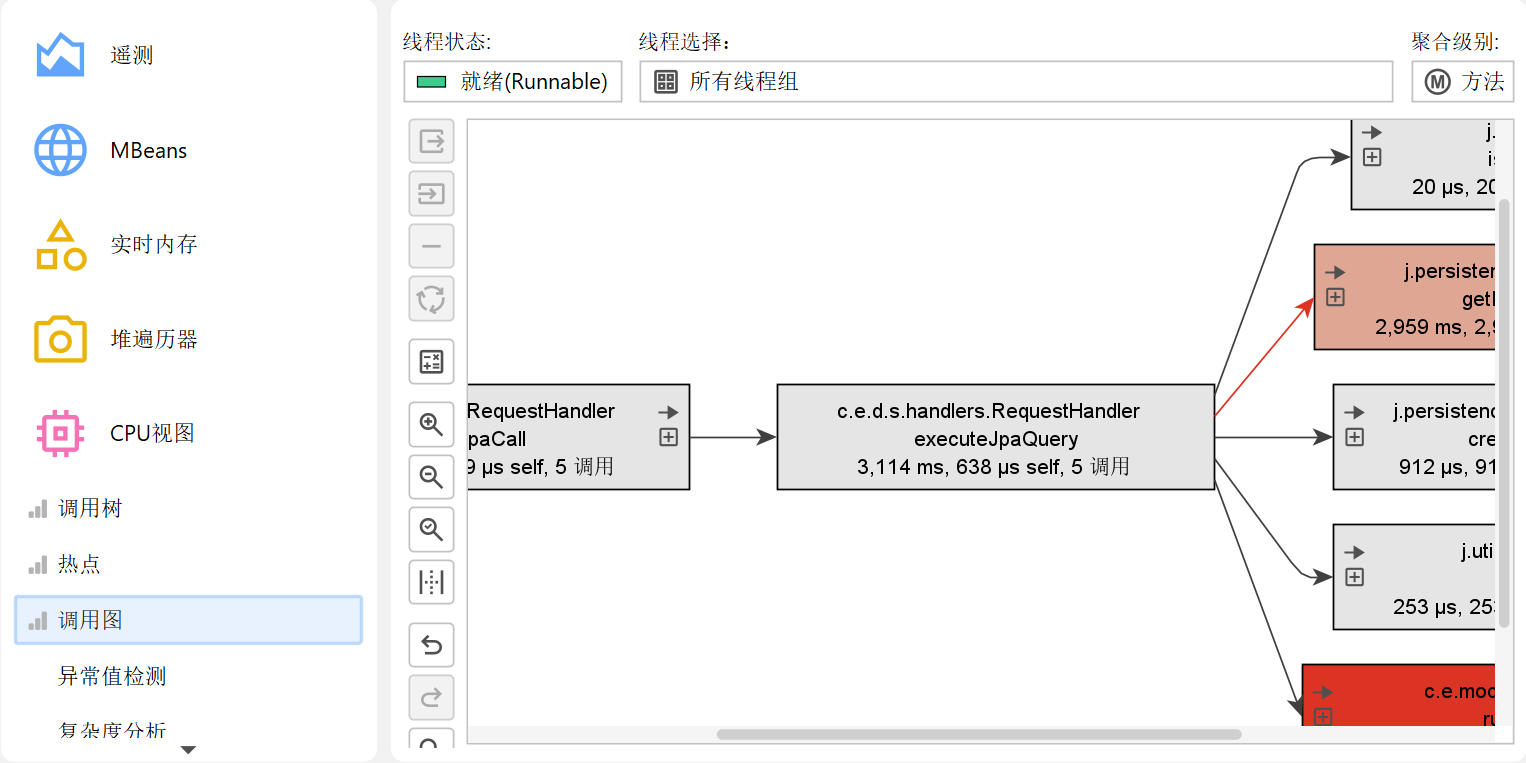 测量方法调用 (method call) 所用时间是一项可选记录,和分配 (allocation) 记录类似。方法调用 (method call) 会被累积到一棵树中,并有多种视图从不同角度展示记录的数据,比如调用图 (call graph)。此类数据的记录在JProfiler中称为“CPU recording”。
