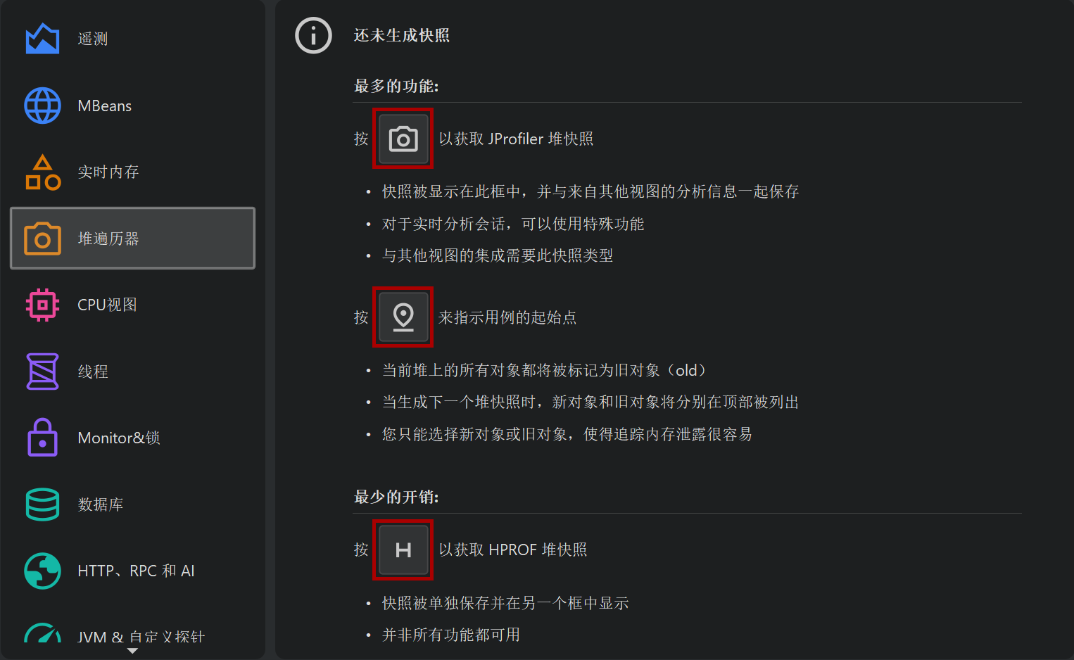 JVM有一个专门的触发器 (trigger) 用于将整个堆转储到文件,该功能以旧的HPROF分析代理命名。这与分析接口无关,也不受其约束。因此,HPROF堆转储速度更快,资源占用更少。缺点是,在堆遍历器中查看堆快照时,您无法与JVM保持实时连接,部分功能也不可用。