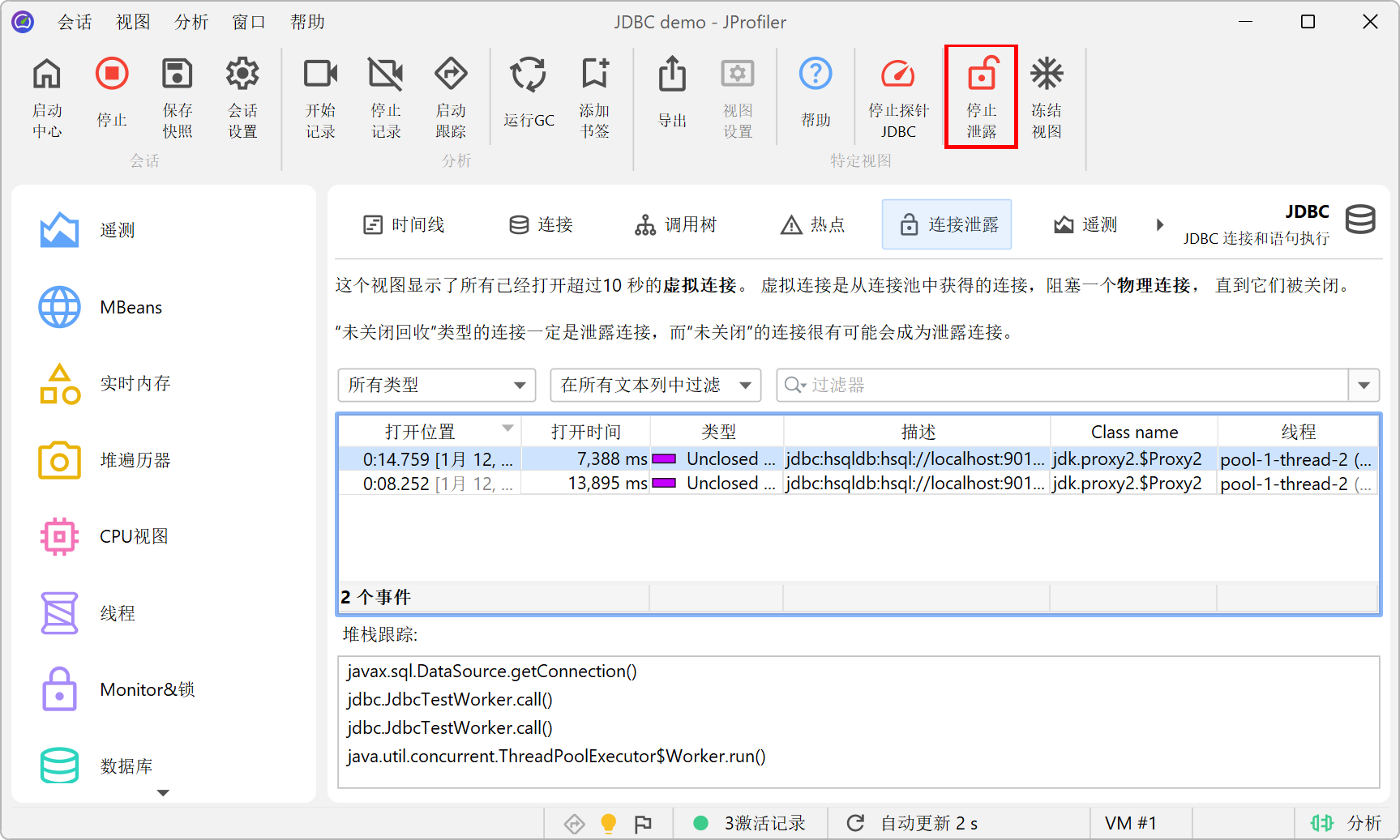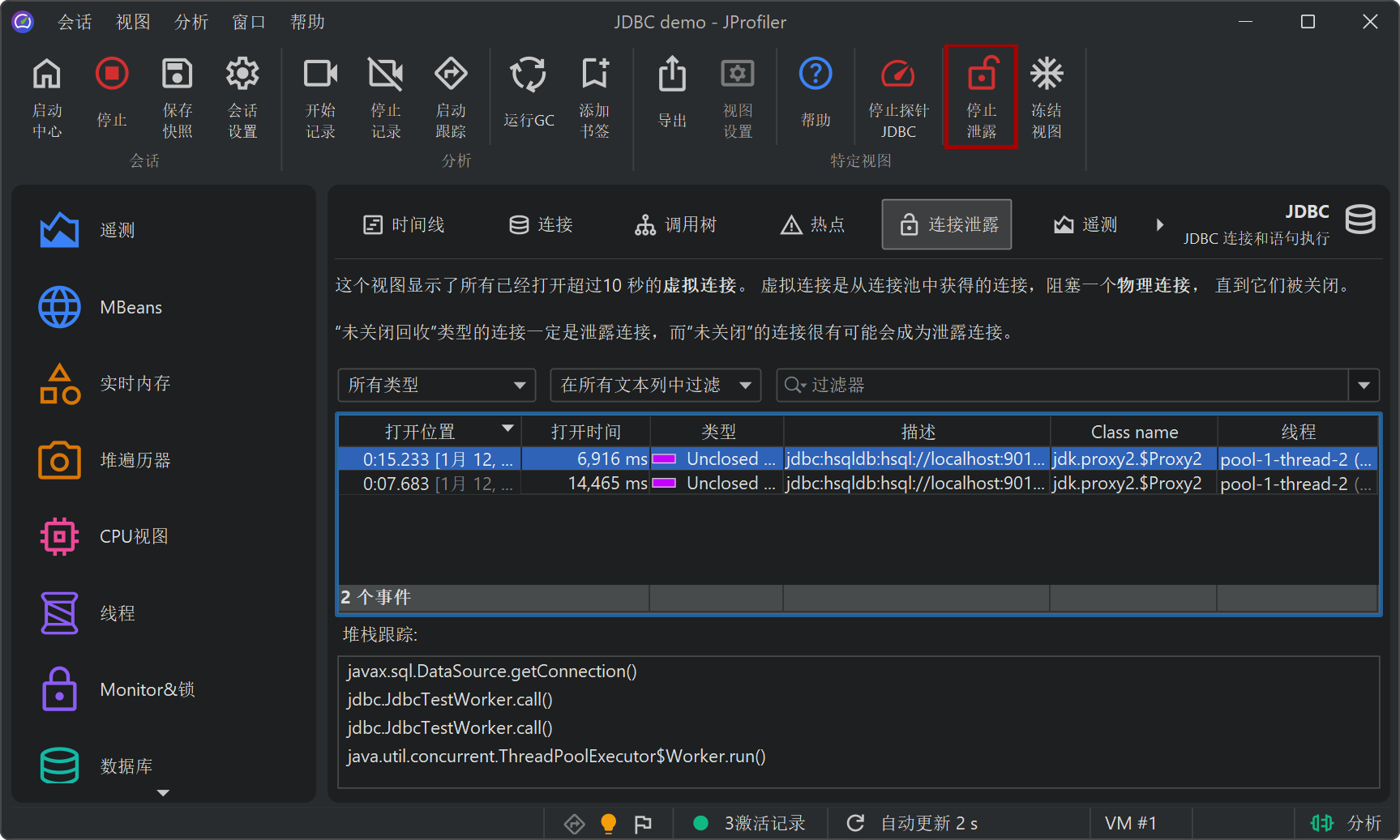 JDBC探针 (probe) 还有第三种记录操作,用于记录JDBC连接泄漏 (connection leak)。只有在您实际调查此类问题时,才会产生查找连接泄漏 (connection leak) 的相关开销。与事件记录操作一样,泄漏记录操作的选择状态也是持久的。