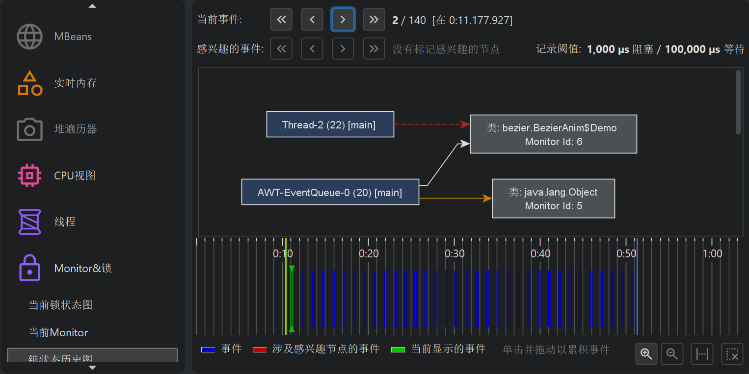 当您开启monitor recording后,“Locking history graph”和“Monitor history”视图将开始显示数据。