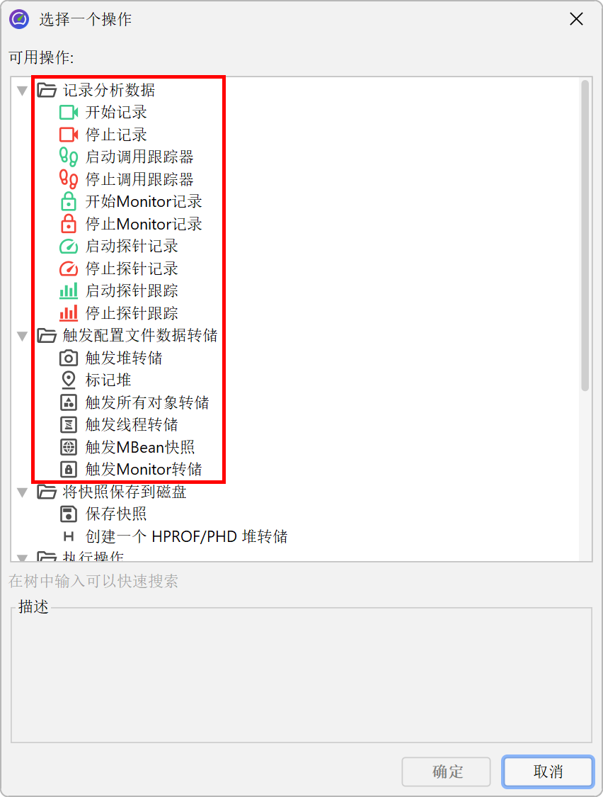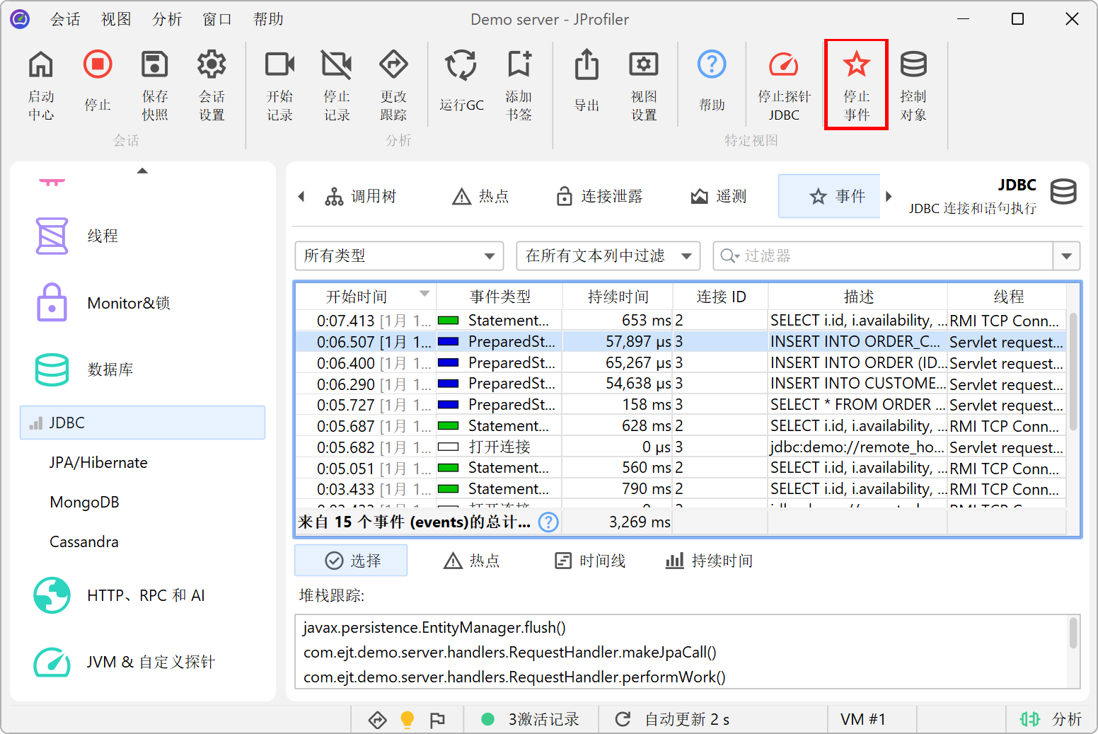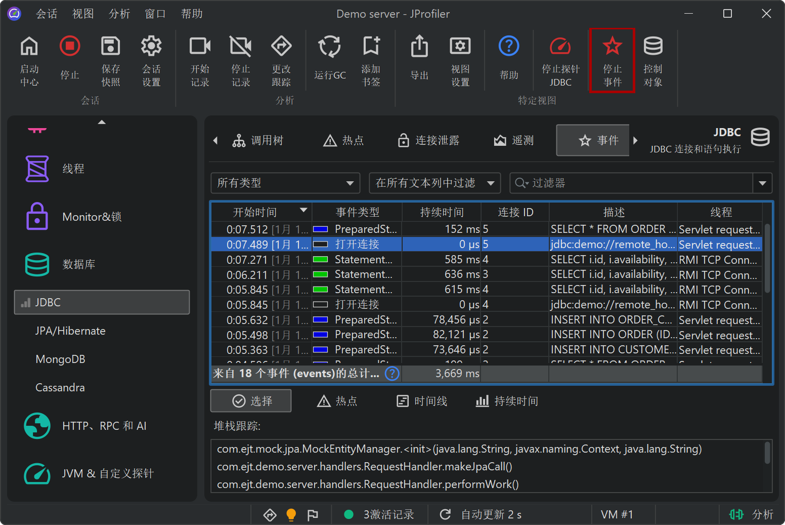 探针 (probe) 展示JVM中的高层子系统,如JDBC调用或文件操作。默认情况下,不会记录任何探针 (probe),您可以为每个探针 (probe) 单独切换记录。有些探针 (probe) 几乎不会带来开销,有些则会根据应用行为和探针 (probe) 配置产生大量数据。