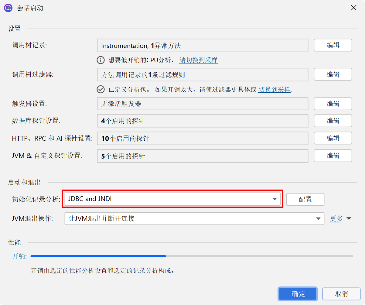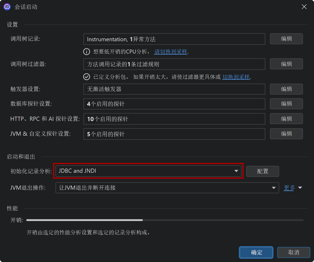 记录配置文件 (recording profile) 定义了一组可以原子激活的记录组合。JProfiler会尝试为您大致估算所选记录带来的开销,并尽量避免有问题的组合。尤其是分配 (allocation) 记录和CPU recording不建议同时开启,因为分配 (allocation) 记录会显著影响CPU数据的计时。