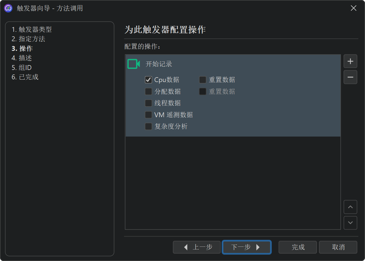 有时您希望在特定条件发生时启动记录。JProfiler有一套定义触发器 (trigger) 的系统,可以执行一系列操作。可用的触发器 (trigger) 操作也包括更改当前激活的记录。