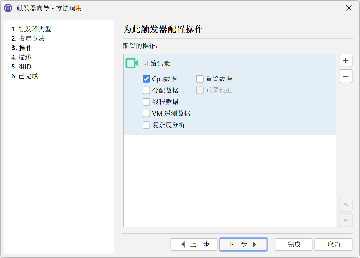例如,您可能只想在某个方法被执行时才开始记录。在这种情况下,您可以进入会话 (session) 设置对话框,激活Trigger Settings标签页,并为该方法定义一个方法触发器 (trigger)。在操作配置中,您可以选择多种不同的记录操作。