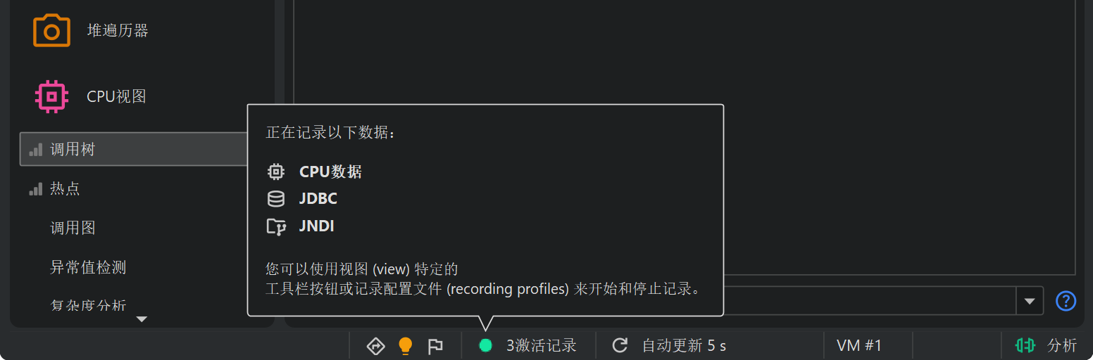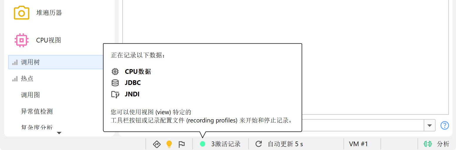 在会话 (session) 运行期间,您可以随时激活记录配置文件 (recording profile)。记录配置文件 (recording profile) 不是叠加的,它会停止所有未包含在配置文件中的记录。通过Stop Recordings按钮,您可以停止所有记录,无论它们是如何被激活的。要查看当前激活了哪些记录,将鼠标悬停在状态栏中的记录标签上即可。
