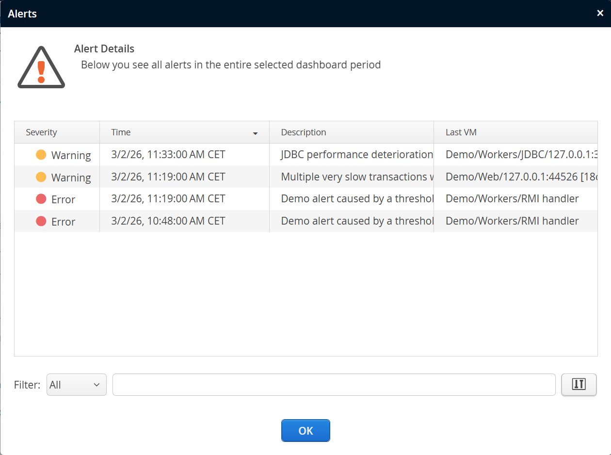 Clicking on the alert bar brings up the alert detail dialog where you can see exact times, categories and the text messages that were configured in the trigger action. To view all alerts in the time range that is currently displayed by the transaction time line, click on the "show all alerts" link in the top-right corner.
