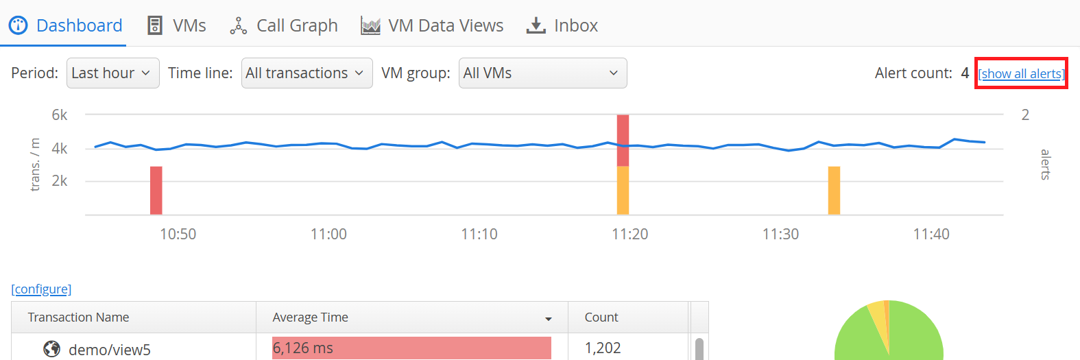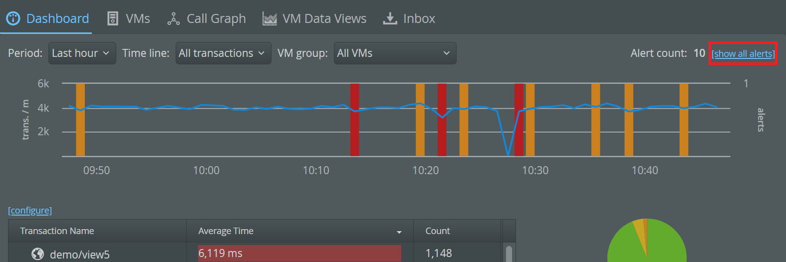 Alerts are displayed in the dashboard. They are drawn as alert bars over the transaction timeline. In this way, you can quickly correlate an alert with an increase in the general activity of your application.