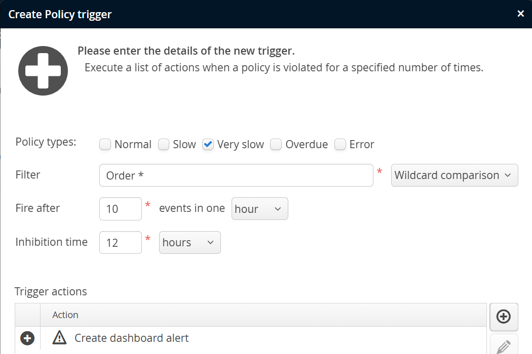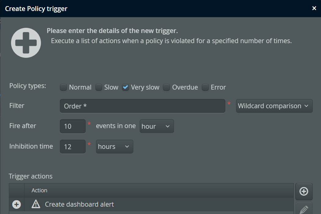To create alerts, you have to add a trigger that fires for a specified policy or threshold violation. In the list of actions, add a "Create dashboard alert" action.