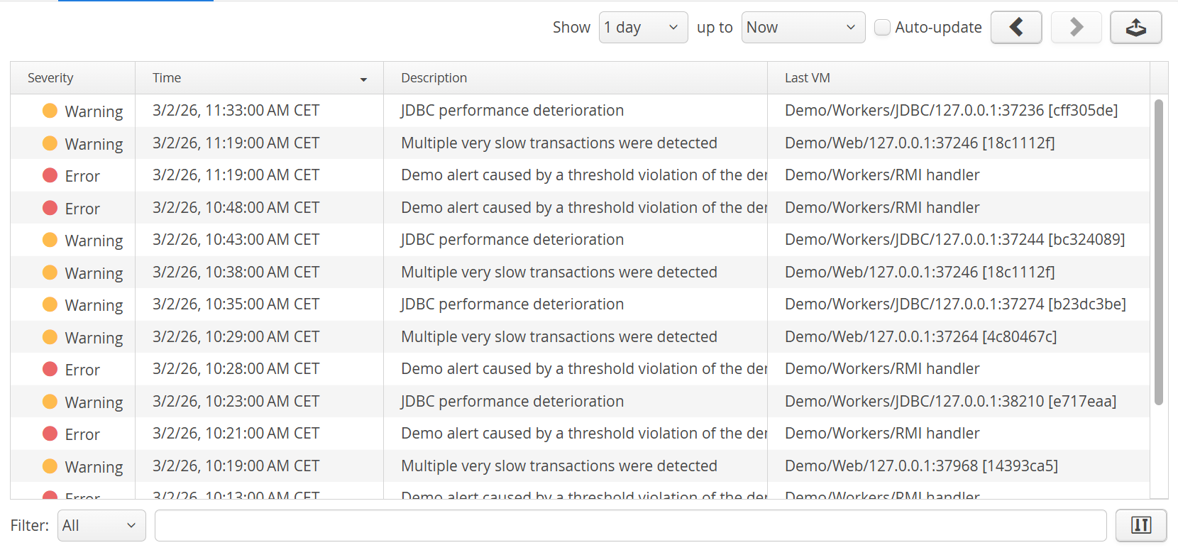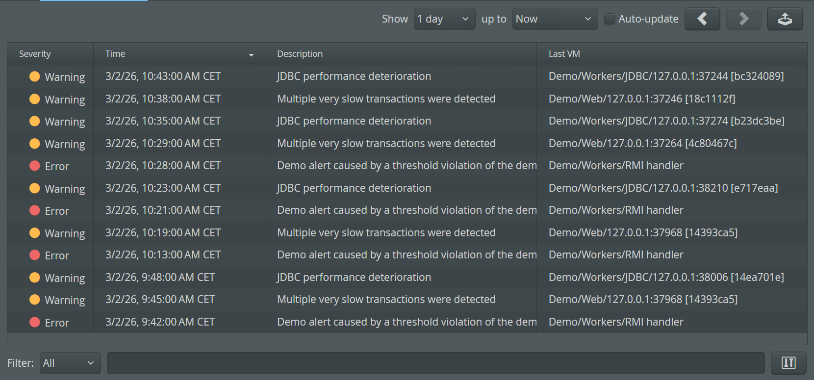 To analyze alerts in a historical context, go to the alerts view in the "VM data views". Here you can see alerts from previous days, weeks or months. If the "Auto-update" check box is selected, alerts are displayed as soon as they are generated by perfino. Also, you can inspect alerts from a single VM only, which is not possible in the dashboard.