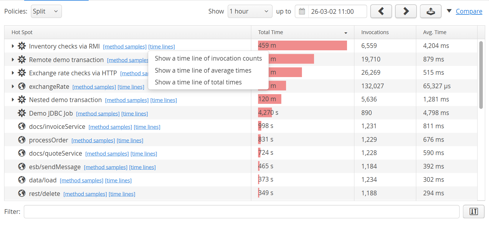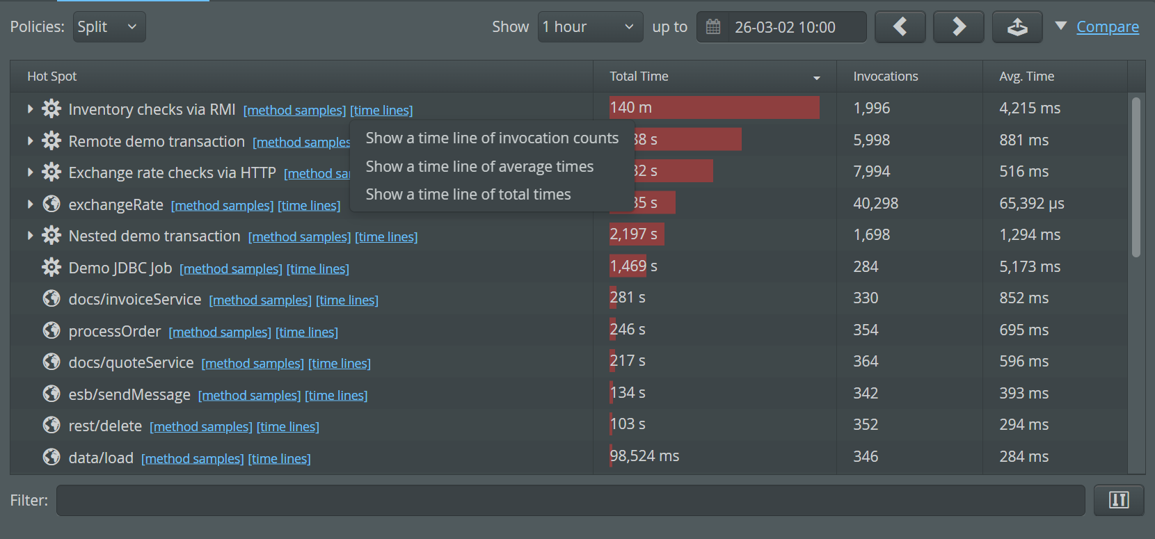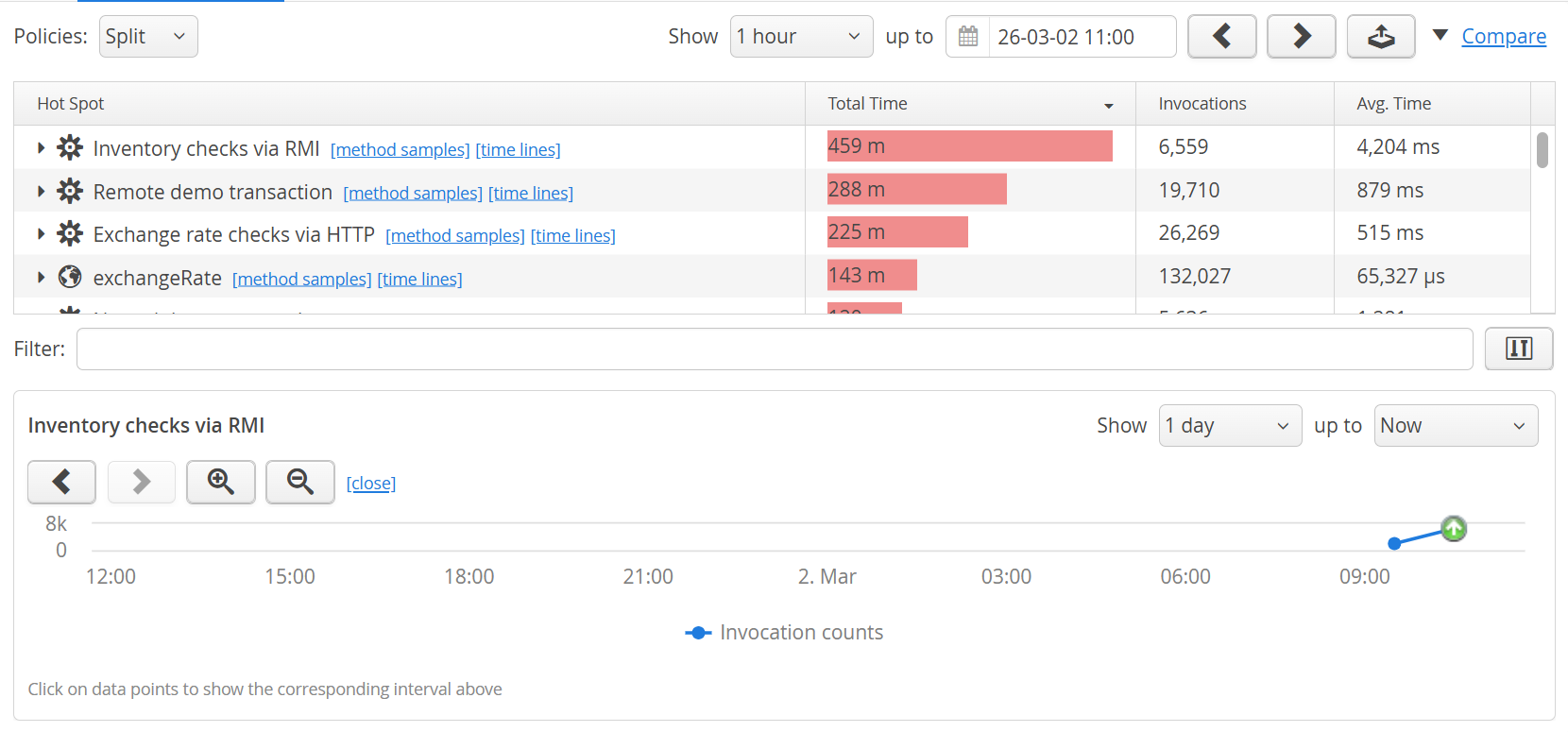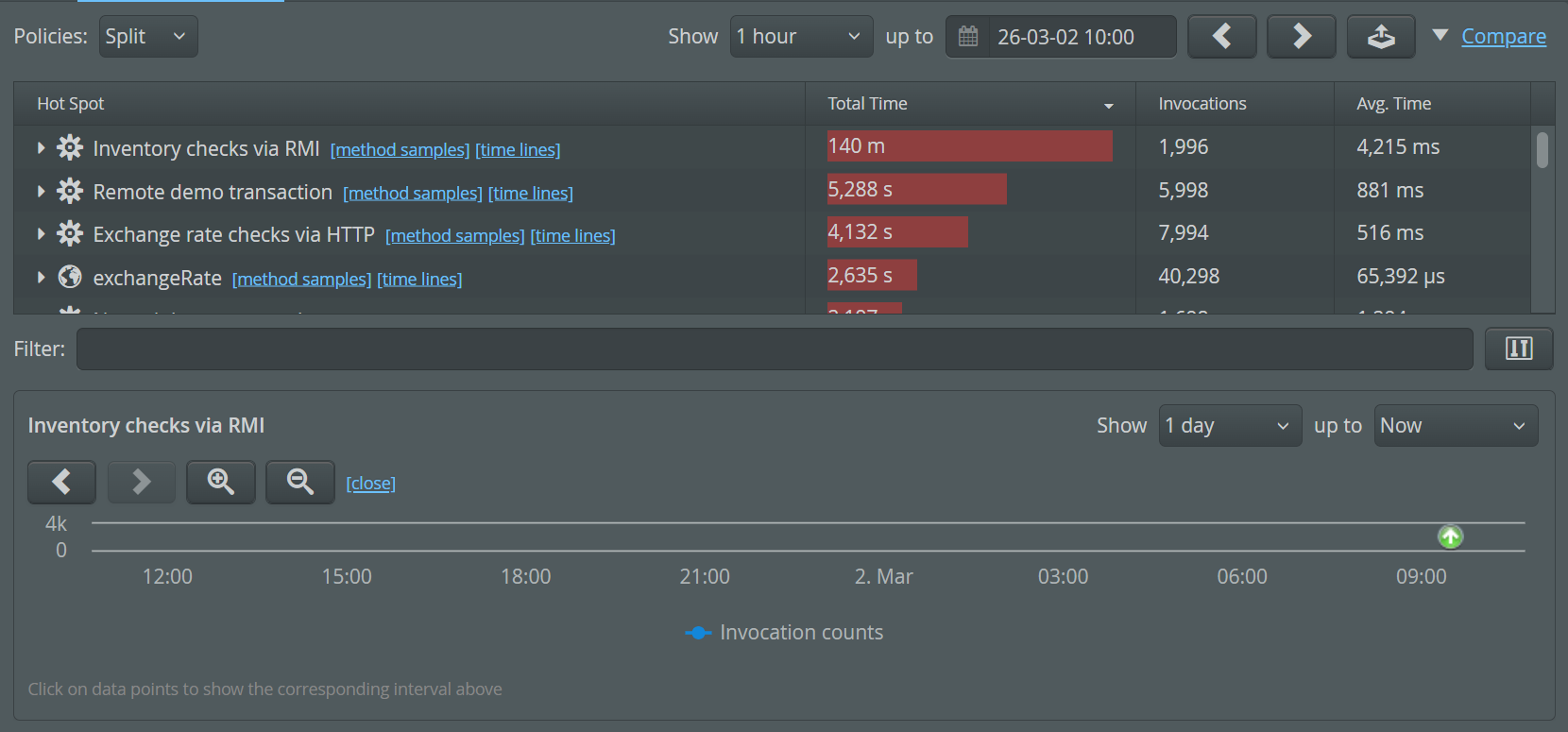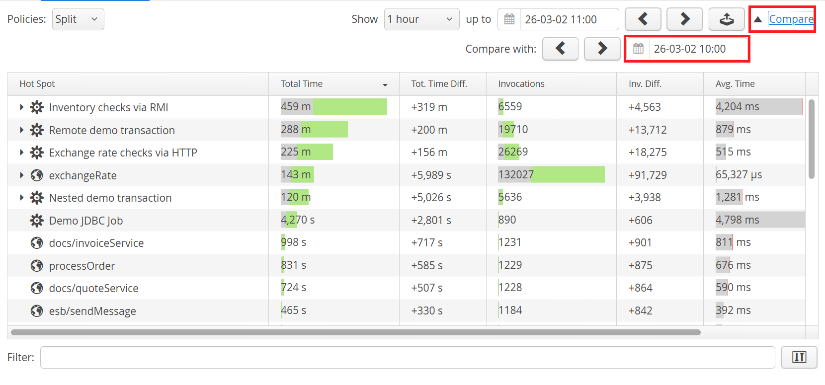 Content comparisons are available in the views that show transactions as well as the probe hot spots views. To start a comparison, click on the "Compare" link in the top right corner. This immediately shows you a comparison between the following intervals:
