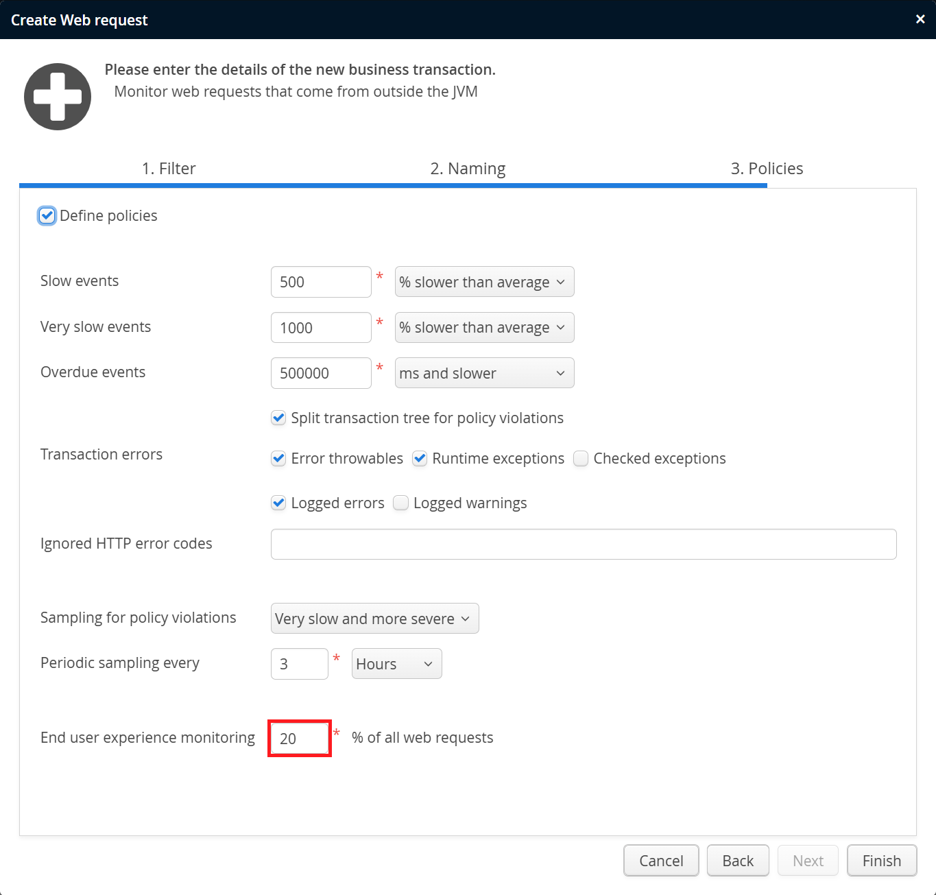 Typically, you do not need page load times from all HTTP requests that create HTML pages, so you just sample a particular percentage. This percentage value can be configured in the policies configuration of web transactions. To disable this feature, set the percentage value to 0%.