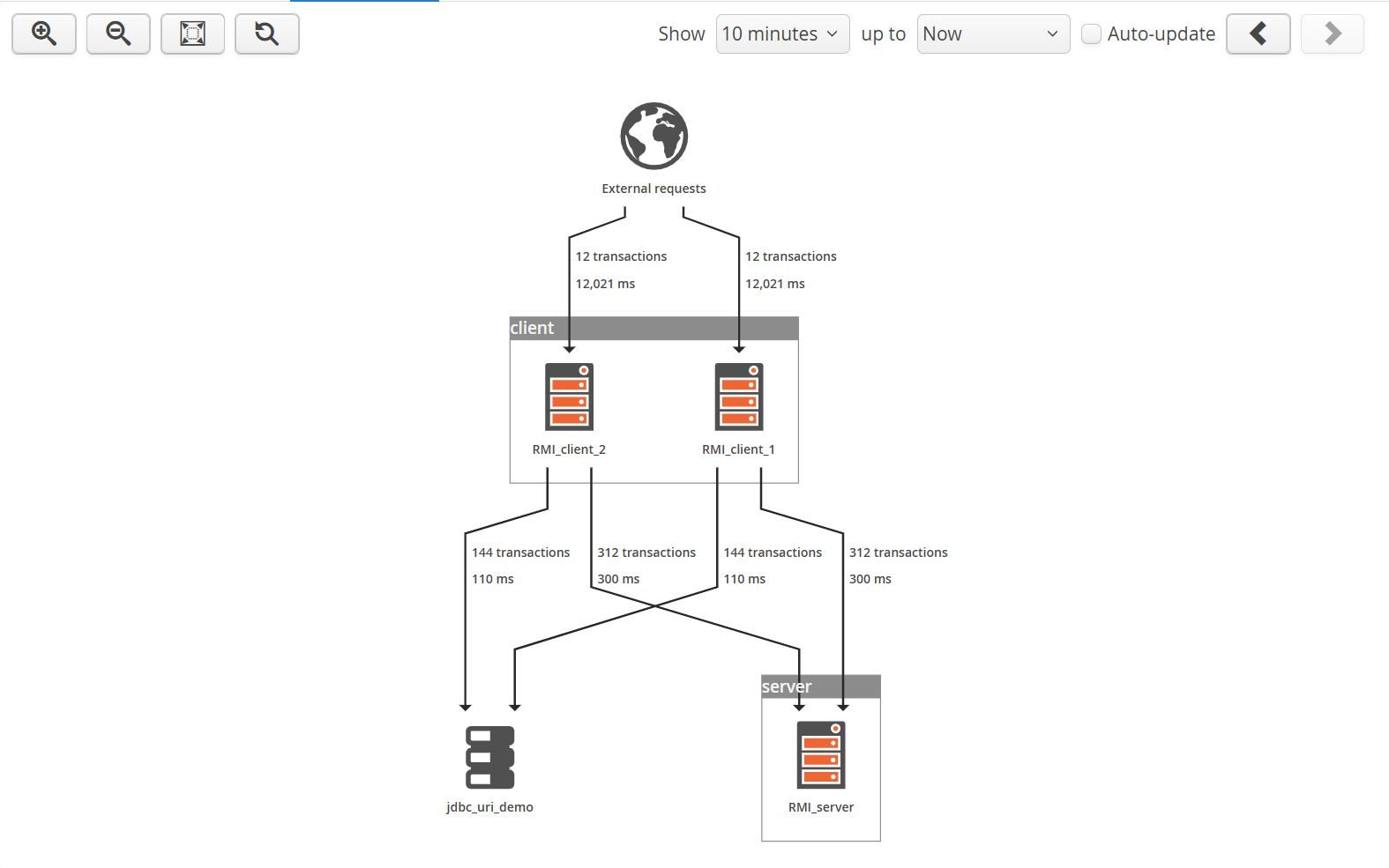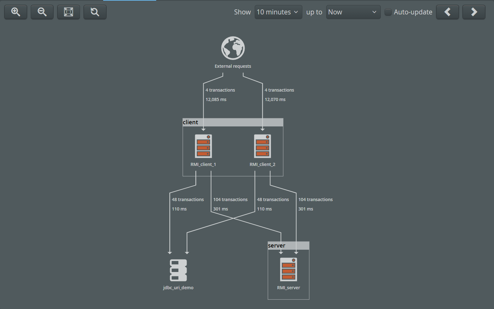 The natural representation for remote calls is the call graph, where each pair of VMs that participate in a remote call are connected by an edge. In addition, two other node types are present in the call graph that usually represent calls to and from external processes: