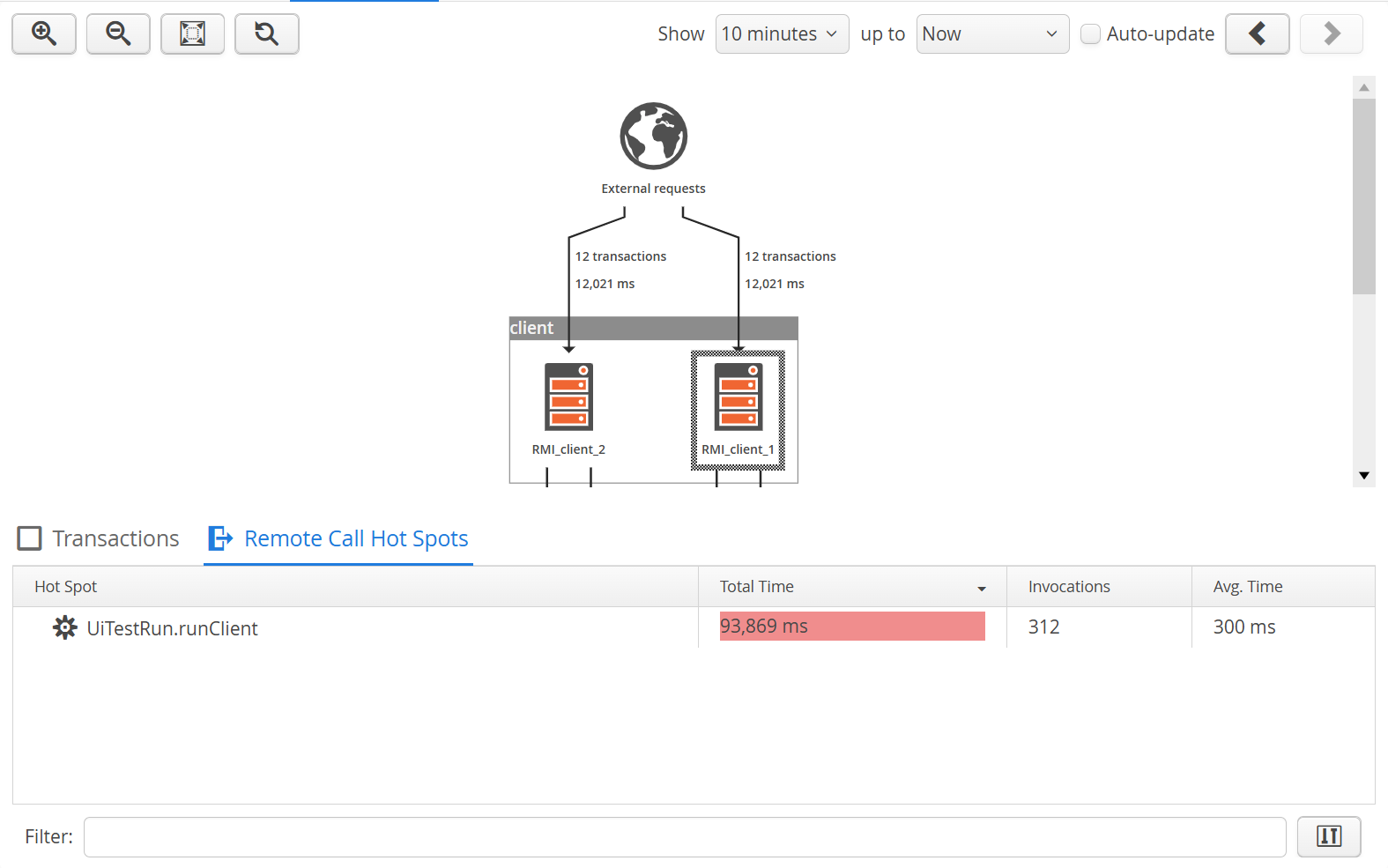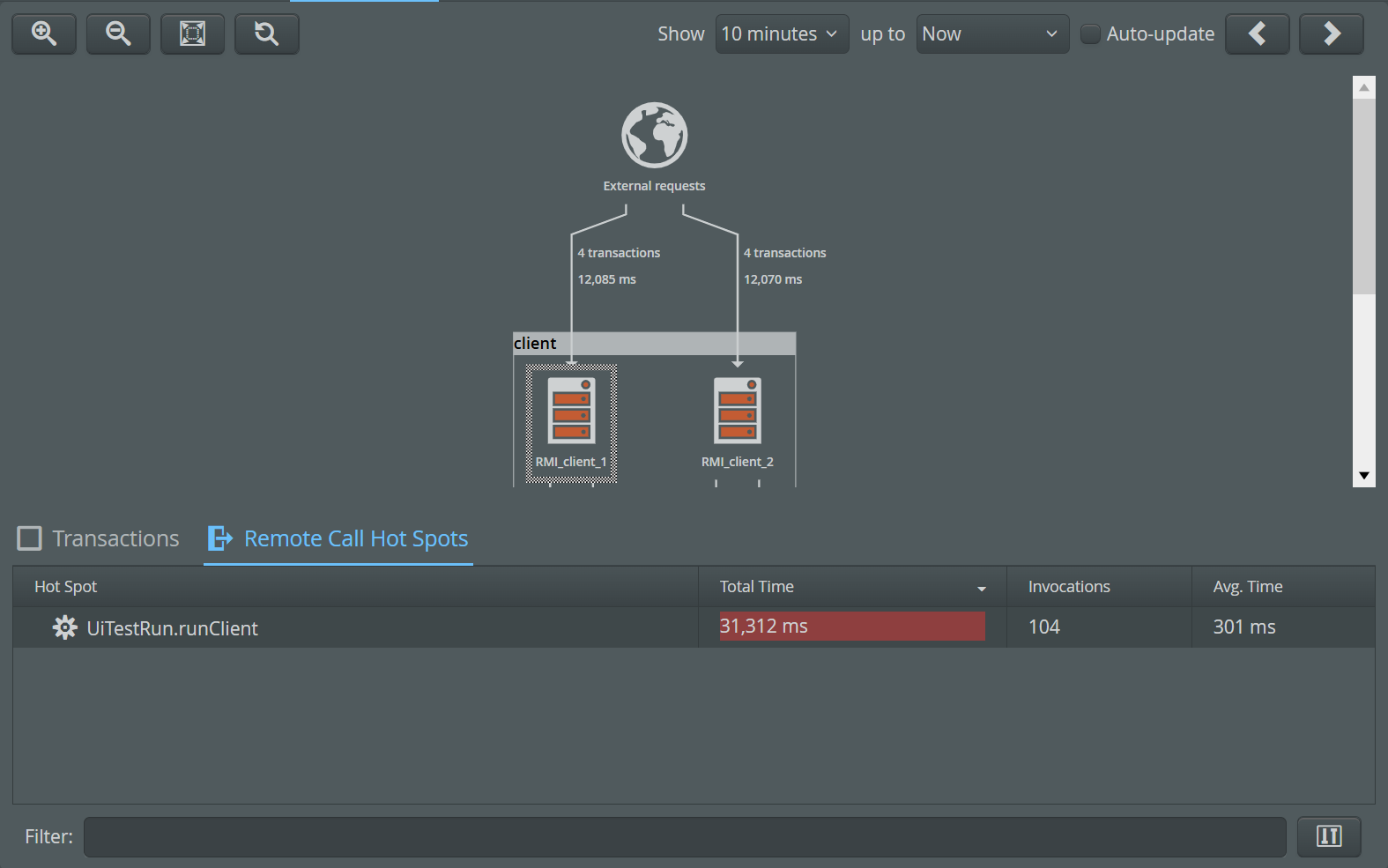 The "Remote origin hot spots" tab shows the duration and count of handled remote calls mapped to the originating transactions from other monitored VMs. Backtraces are resolved up to the leaves that specify the VMs where the calls originated. The "Transactions" tab shows the call tree of all transactions executed in the selected VM. Finally, the "Remote call hot spots" tab shows the duration and count of remote calls originating in the selected VM. The top-level hot spots are the transactions that cause the jump into a different monitored VM. Check the outgoing edges to learn more about those calls. -