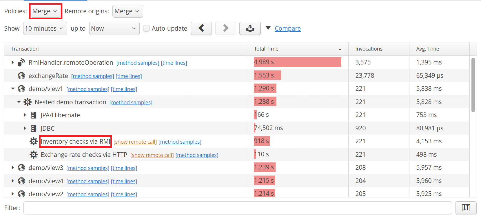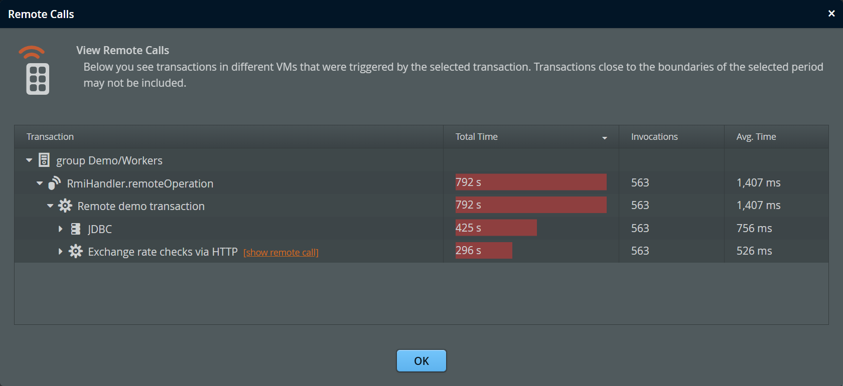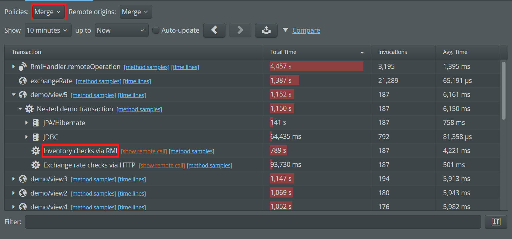 In the call tree, you can recognize transactions that cause a remote call by the "show remote call" link that is shown next to the transaction name. When following such a link, it is advisable to select the "Merge" option for the policy split, otherwise the numbers on the remote side may not match the numbers in the source VM. This is because policy splitting is not tracked across VMs. In any case, there may be small discrepancies due to calls that are close to period boundaries which may be assigned differently by source and target VMs.