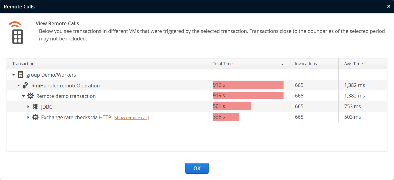 The call tree only shows the transaction in the target VMs. If there are further remote calls, you will see "show remote call" links, just like in the original call tree view. Clicking on those links replaces the call tree in the dialog and shows a Back In History button that can be used to return to the previous level. If the button disappears after clicking it, you are now looking at the first level.