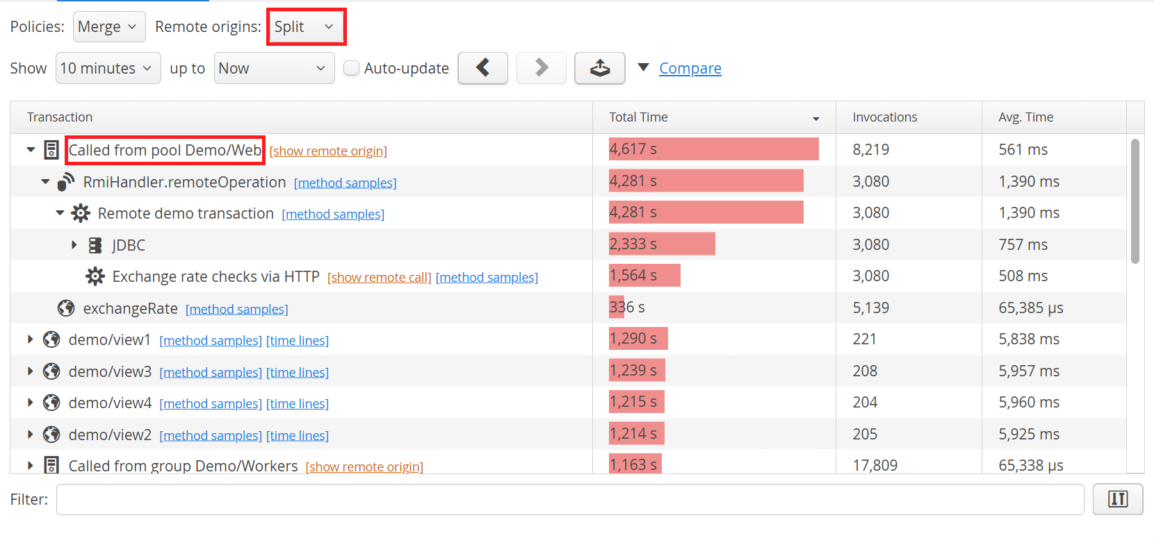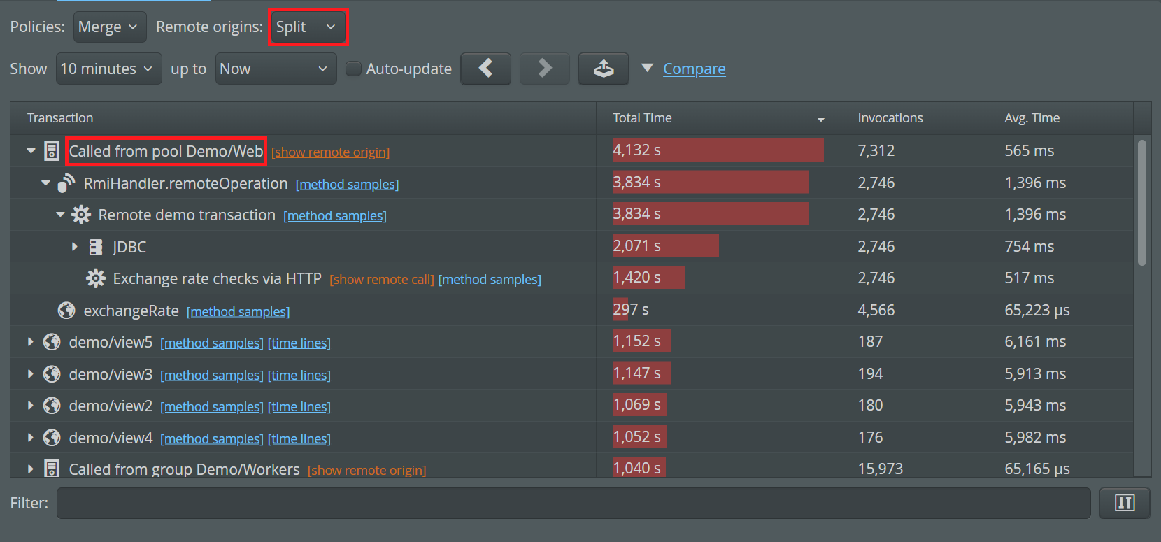 It is also possible to move in the opposite direction and ask which remote calls in other VMs started transactions in the currently selected VMs. First, change the remote origins drop-down to "Split". By default, that drop down is set to "Merge" and you cannot see the remote origins. With the "Split" setting, "Called from ..." nodes appear at the top-level containing transactions that were started by remote calls from other monitored VMs. If you are looking at VM group or VM pool data, a split is performed for each VM group, but not for individual VMs. If the data is not granular enough, consider making your VM group structure more granular. If you are looking at the data for a single named VM, the split is performed for each remote VM.