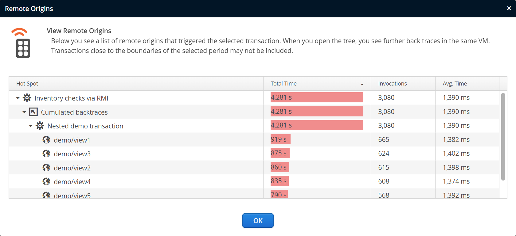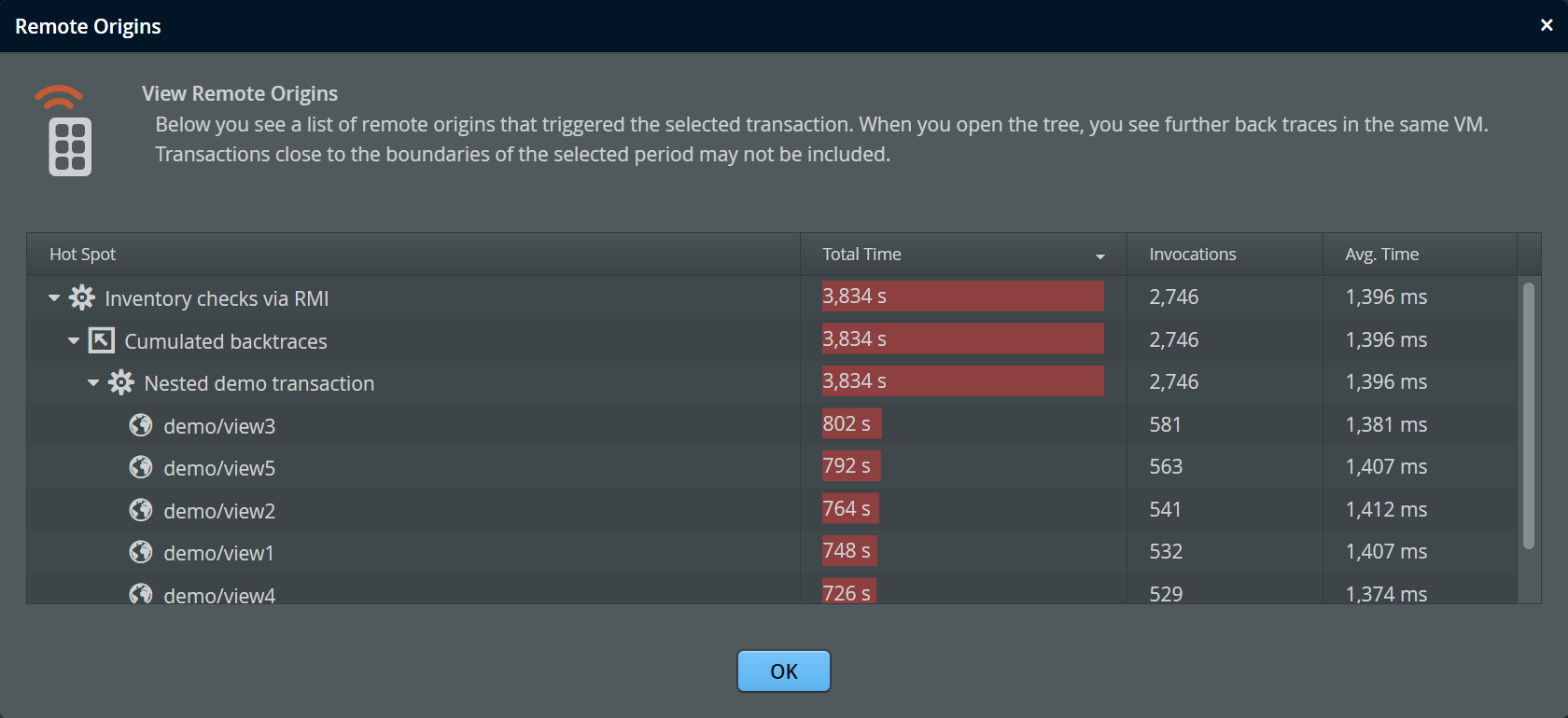 Similarly to remote calls, clicking on the "show remote origins" link brings up a modal dialog. In the dialog, the count and duration of the selected transaction is attributed to the remote transactions that started it. The data is presented as hotspots with the innermost transactions from the originating VM at the top level. Analogous to the "remote calls" dialog, you can jump further back in a chain of remote calls when you see a "show remote origins" link next to a transaction. The Back In History button brings you closer to the original transaction.