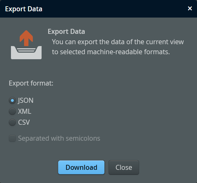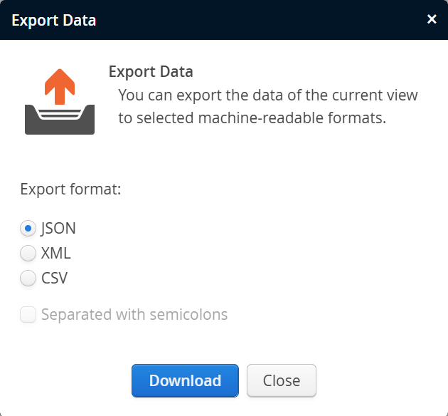 The output will be plain text. If multiple columns are available, CSV data is written. For hierarchical data, only the top-level will be exported. The separator is a comma by default, but you can change this with thecsvSeparatorURL query parameter. ThewinLineBreakURL query parameter changes the default line feed from LF to CR+LF. -