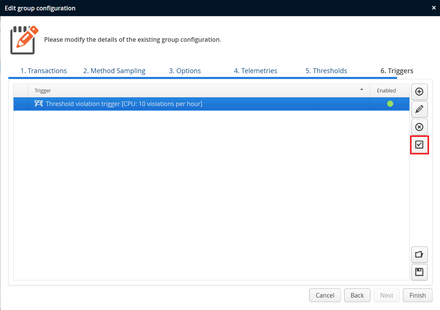 Threshold triggers are fired when the rate of threshold violations for a selected telemetry exceeds a configured value. This requires that you have configured at least one threshold for the same VM group.