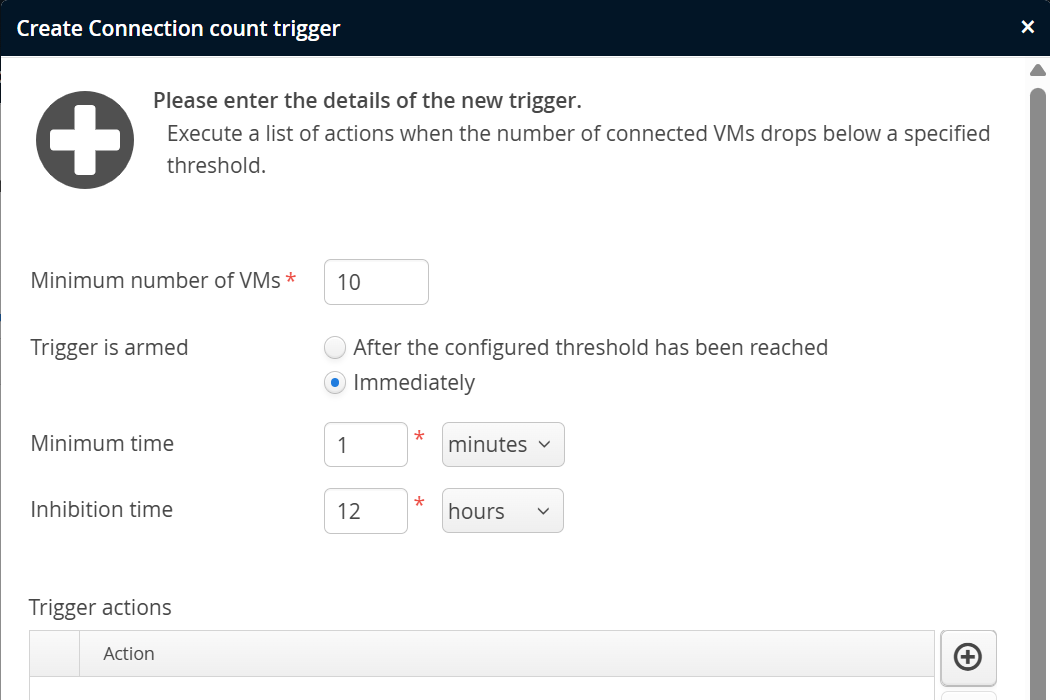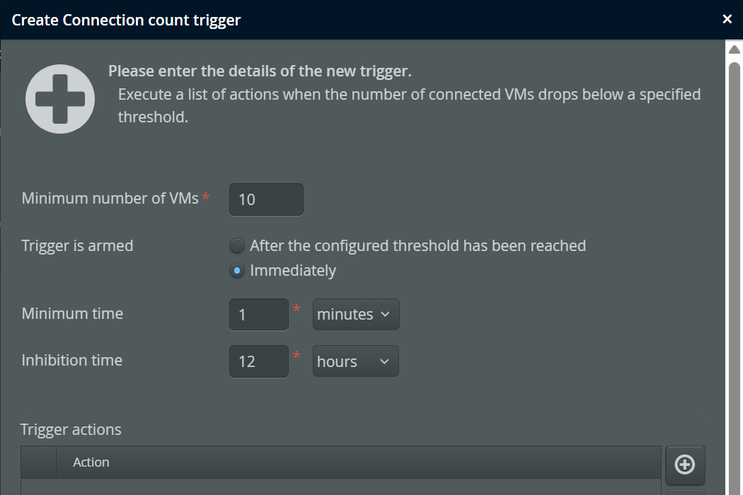 The number of connected VMs is a scalar value that originates in the perfino collector and not in the monitored VMs. The connection trigger is intended to take action in the case that too few VMs are running. The configured minimum number is not reached immediately when the perfino server is started, so you have the option of arming the trigger only after the minimum number has been reached for the first time, or after a fixed amount of time has passed.