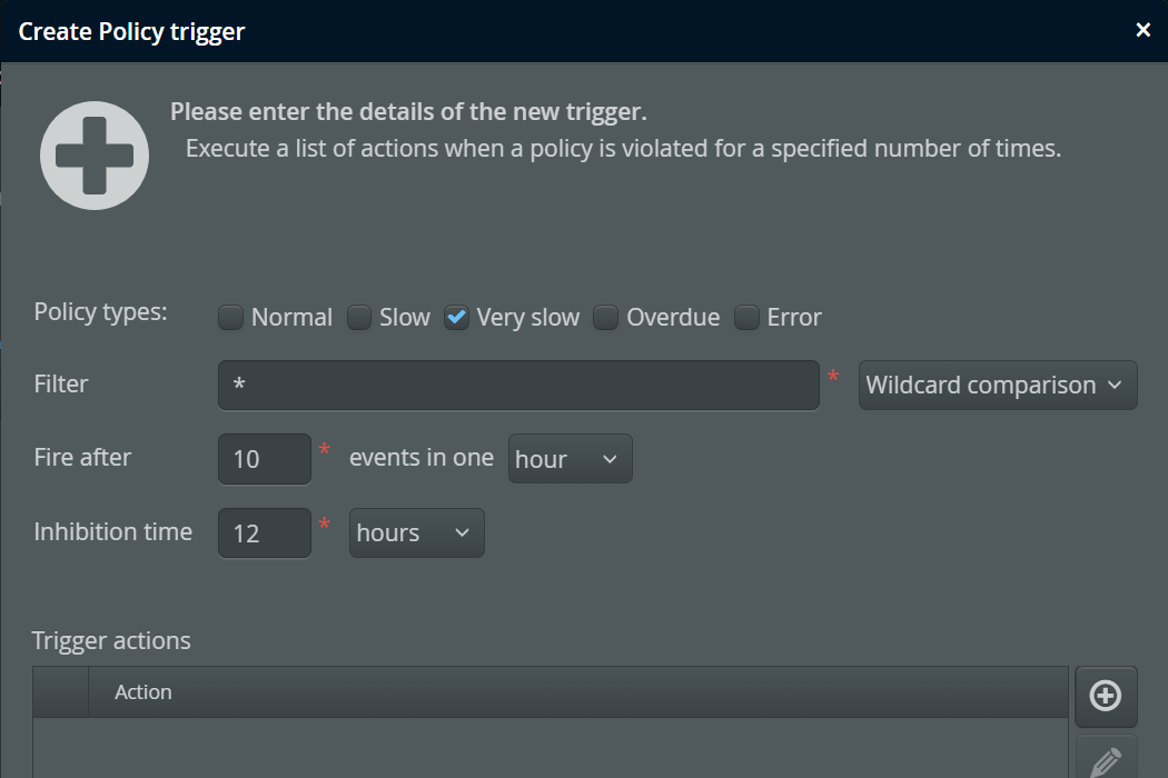 The trigger condition is decoupled from the actual condition of the policy violation. Various transactions can define different times after which a transaction is characterized as "very slow", the policy trigger then counts these events.